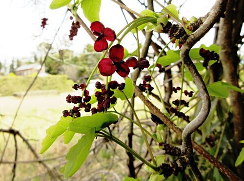 曇り時々晴れで、日中の気温が14℃と少し寒い日になりました。 そろそろアケビの花が咲く頃です。 午前9時過ぎからウォーキングがてら、毎年アケビの花が咲く場所に行ってみました。 今年は開花の時期が遅いようで3ヶ所ほど回って見ました。 ようやくミツバ…